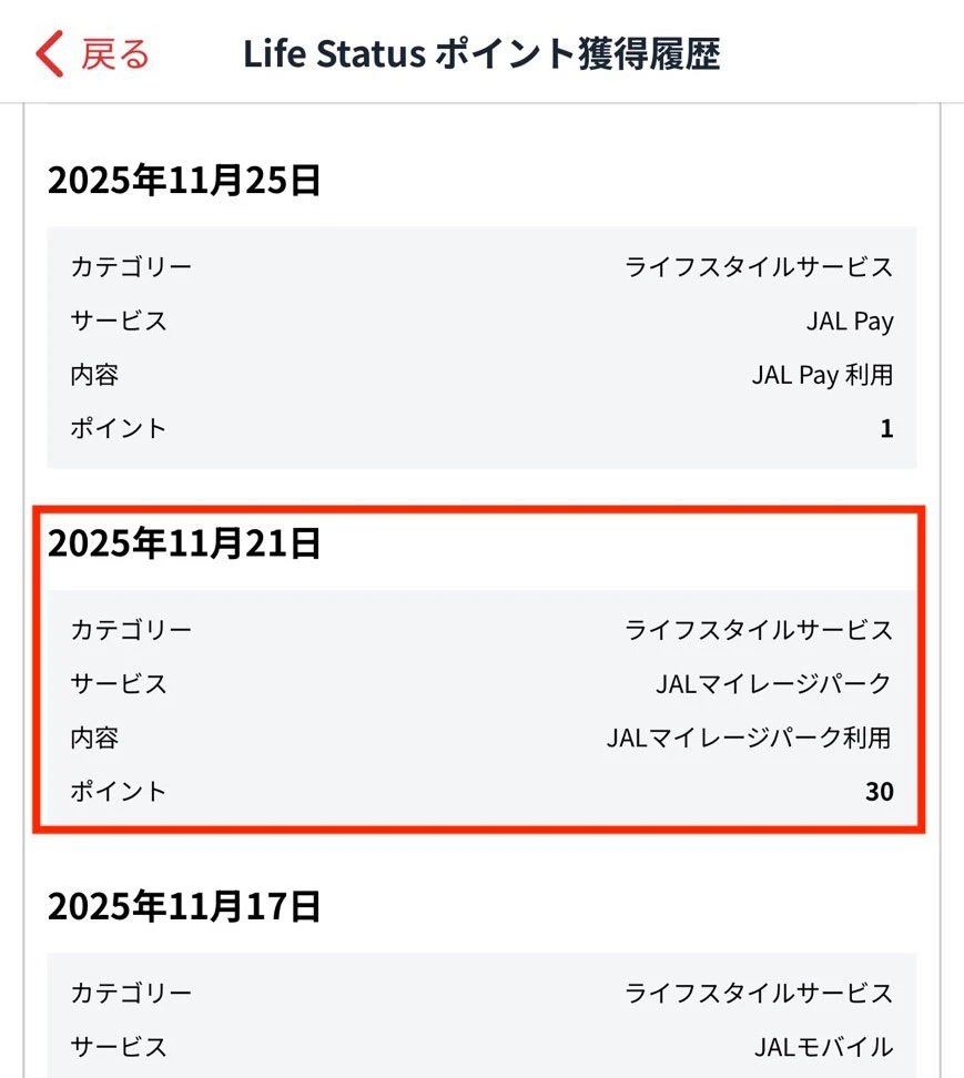 Life Status ポイント積算対象とは書かれているものの、具体的にどのぐらいもらえるかは書かれていないです。このLife Status ポイントについては、こちらのページ(Life Status ポイント(LSP)とは)をご確認いただくとわかりますが、JALマイレージパーク経由でマイルがたまるショップの場合、100マイルごとLSP1ポイントがもらえることが確認できます。