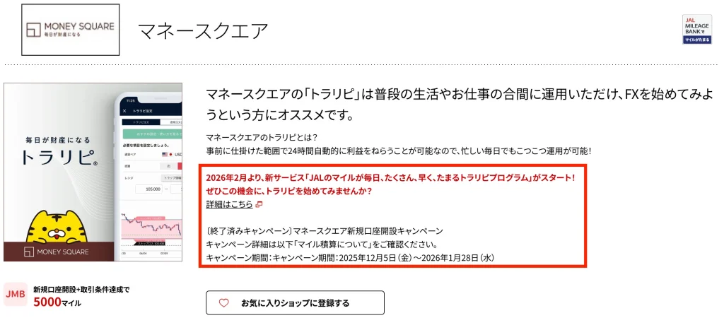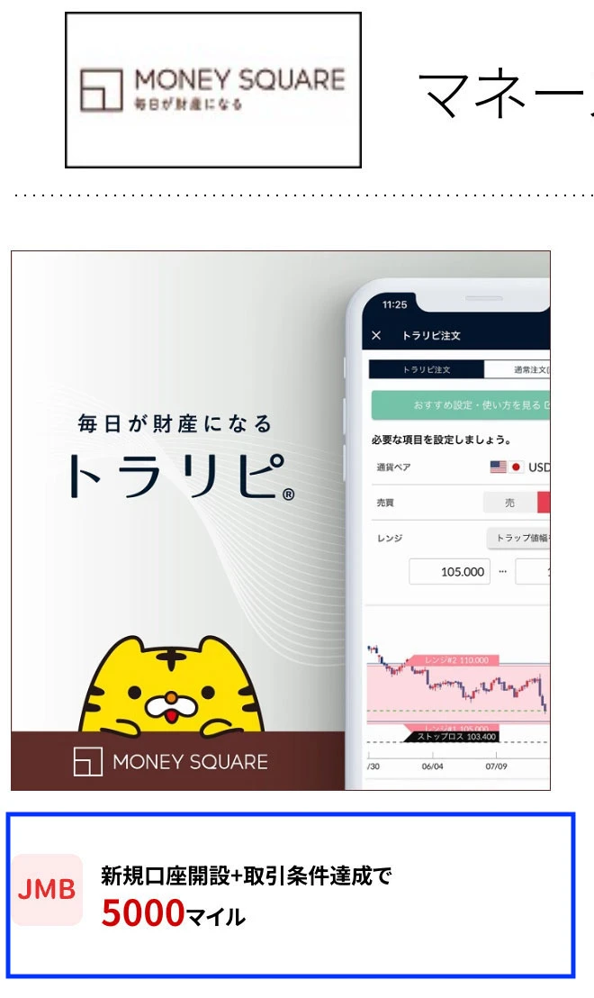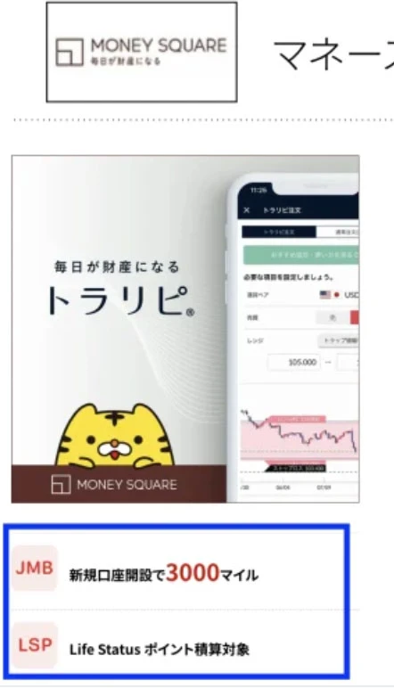 | マネースクエアでの新規口座開設で3,000マイル積算されます。 ※遷移先のページにおいて、ポイント獲得までの流れとして、「90日以内に所定の注文成立※」という記載がございますが、 JALマイレージパークにおいては、所定の注文成立は不要で、「口座開設完了」のみでマイル積算対象となります。 |