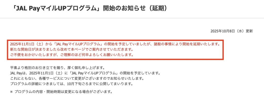 2025年11月1日(土)から「JAL PayマイルUPプログラム」の開始を予定していましたが、諸般の事情により開始を延期いたします。